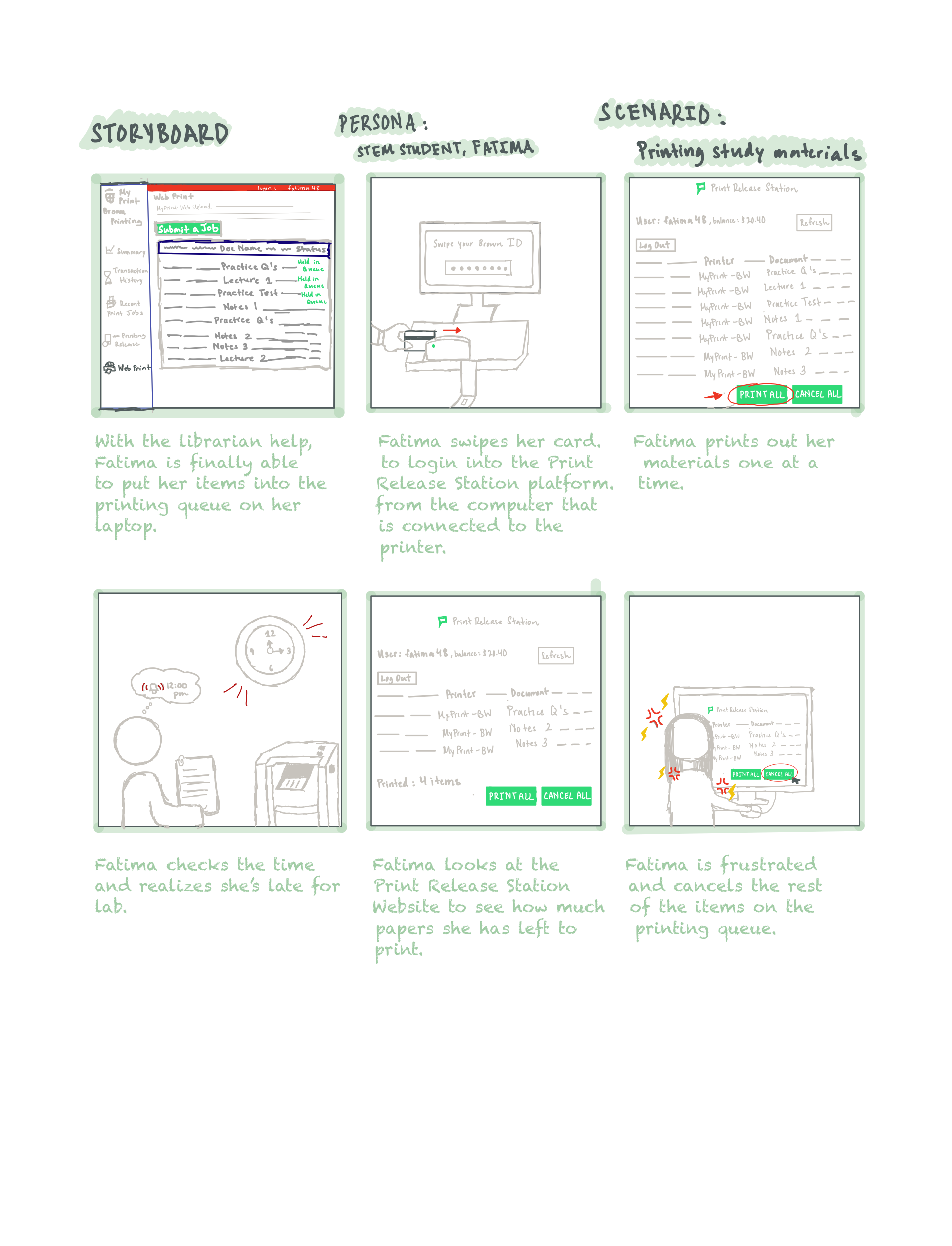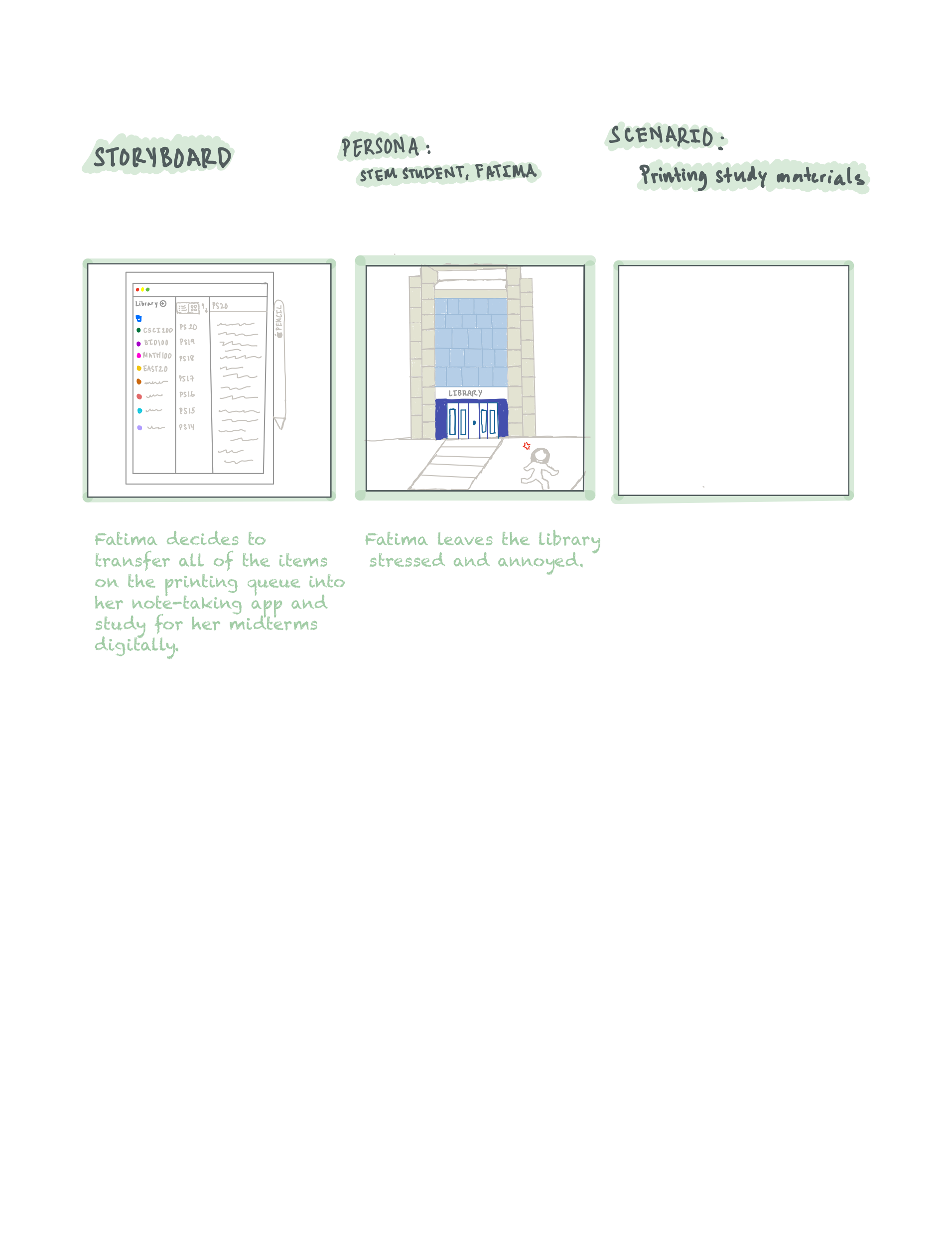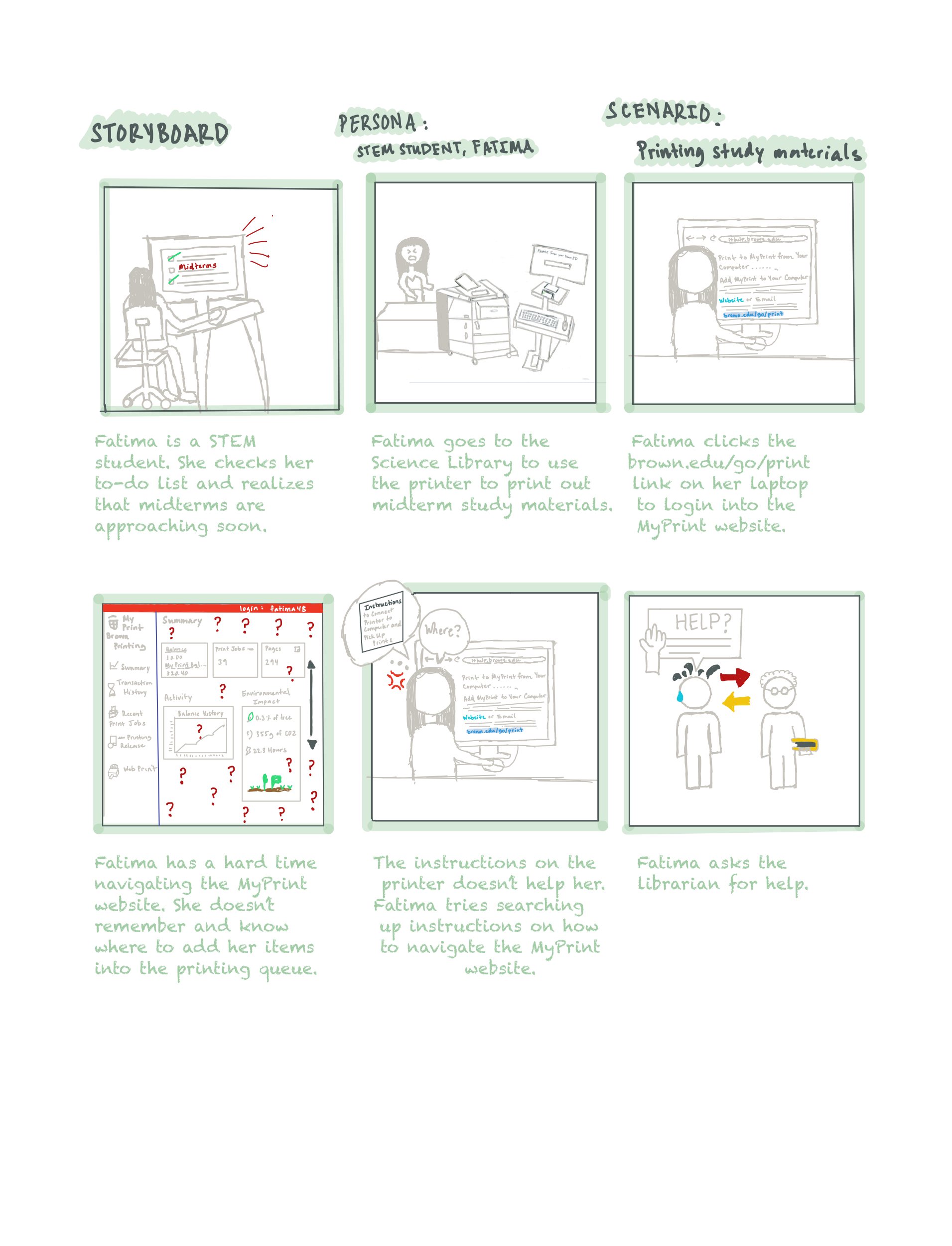 Frantic Fatima is a persona that represents the users of my chosen interface. This is because she’s an extreme user who prints often but is still confused on how to use the website. Her confusion stems from the problems that the personas pointed out: layout of the website is confusing, printers don’t work sometimes at the library, and the printer is slow.
